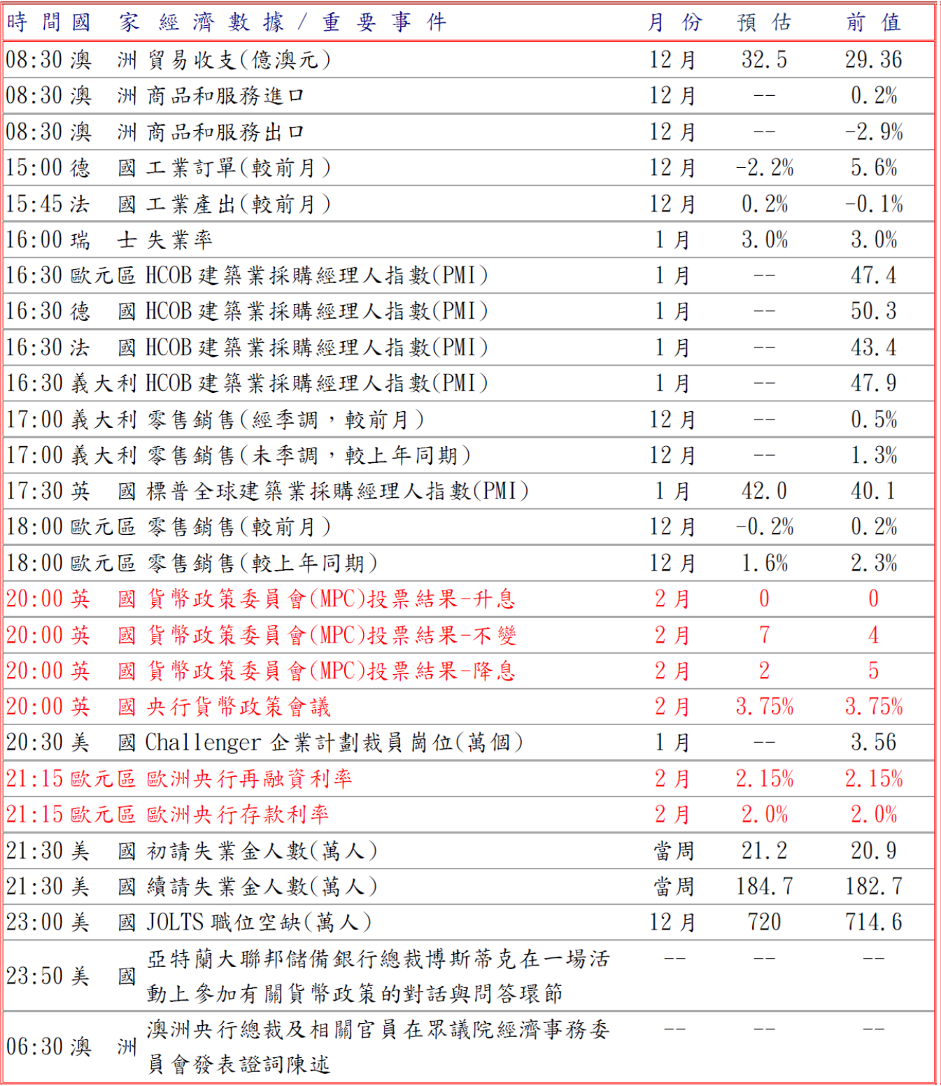 據S&P週三公布英國1月服務業PMI跳升至54.0,創2025年8月以來新高,其中產出預期達到2024年10月以來最高水平,企業訂價達到8月以來的最高增速,這恐將影響英國央行(BOE)於本次會議中對未來的降息時機及降息幅度保持模糊表態,推升英鎊兌美元至1.3733高點。據英國國家經濟社會研究院(NIESR)預測,今年失業率平均恐升至2015年最高水平5.4%,且超過多數預測機構的預期,令英鎊承壓,兌美元下滑至1.3639低點。預估今日英鎊兌美元阻力於1.3670-1.3690,支撐於1.3580-1.3600。