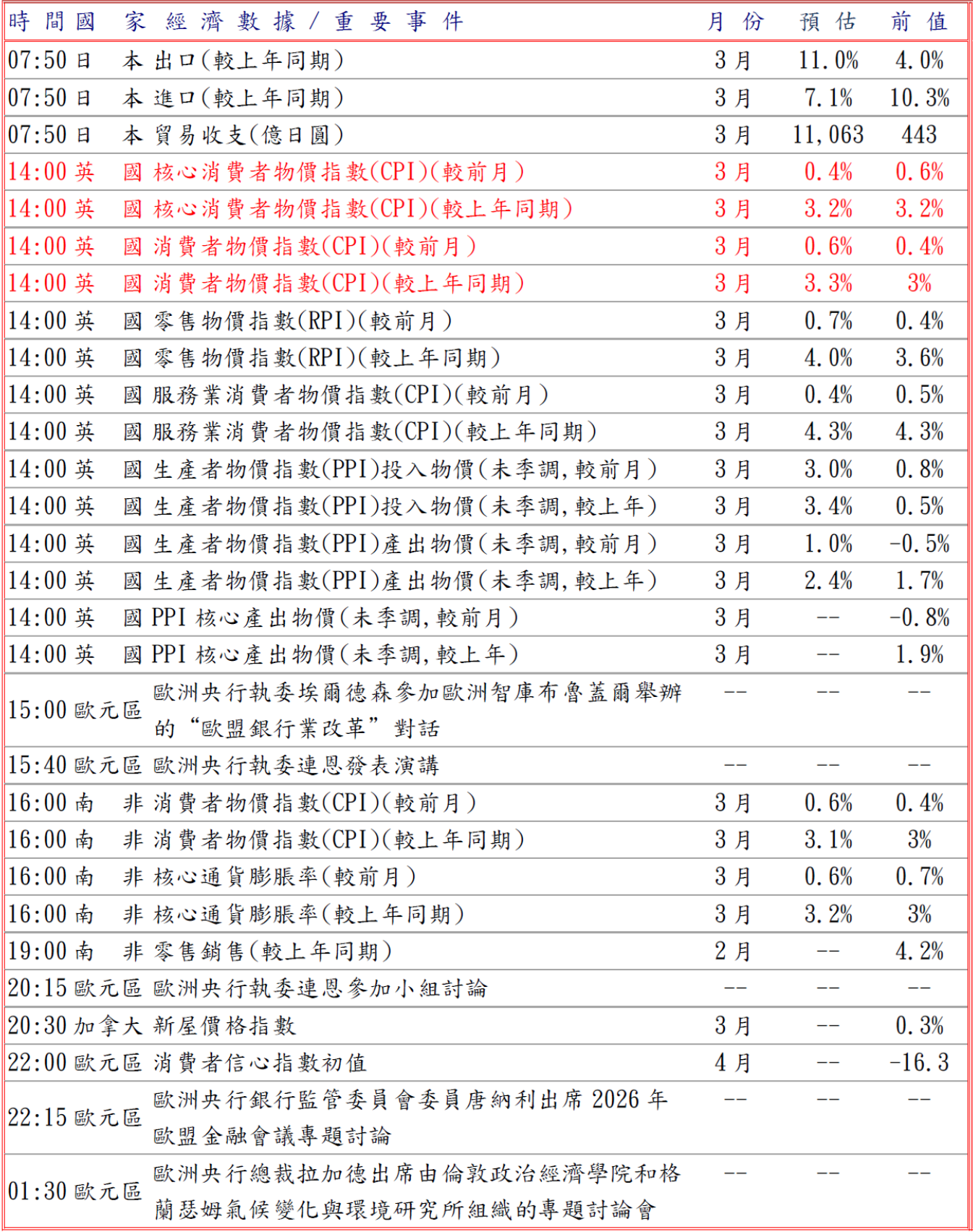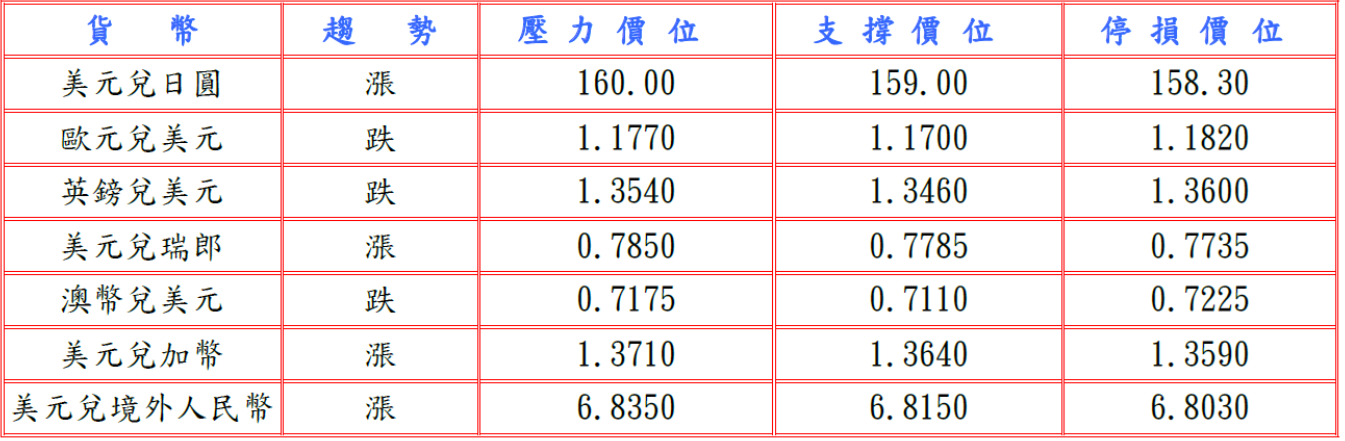 隨後據美國官方公布數據顯示,受到伊朗戰爭推高汽油價格,帶動加油站收入,退稅亦支撐消費,使得3月零售銷售跳增1.7%,同時2月企業庫存環比增加0.4%,增幅高於預期,意味著批發商庫存大幅反彈,第一季庫存投資或將提振經濟增長,而且全美房地產經紀人協會(NAR)公布3月成屋待完成銷售指數上升1.5%至73.7,另外美國聯邦準備理事會(FED)主席提名人沃什否認向川普承諾降息,並推動FED廣泛改革,美元擴大漲幅,兌日圓漲至159.64高點。預估今日美元兌日圓支撐於158.90-159.10,阻力於159.90-160.10。